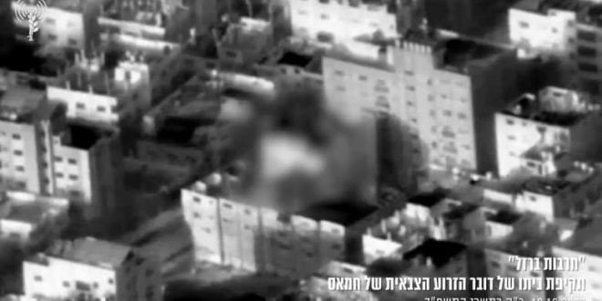 نشر المتحدث باسم الجيش الإسرائيلي، للإعلام العربي، أفيخاي أدرعي، مقطع فيديو يظهر لقطات جوية للحظة استهداف منزل متحدث باسم الجناح العسكري لحركة المقاومة الإسلامية “حماس” في غزة.