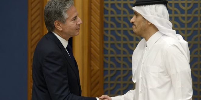 بحث الشيخ محمد بن عبدالرحمن بن جاسم آل ثاني، رئيس الوزراء القطري وزير الخارجية، مع وزير الخارجية الأمريكي، أنتوني بلينكن، مساء الاثنين، الأوضاع في غزة وتطورات الوساطة القطرية لإطلاق سراح الرهائن لدى حماس، حسبما أفادت وكالة الأنباء القطرية (قنا).