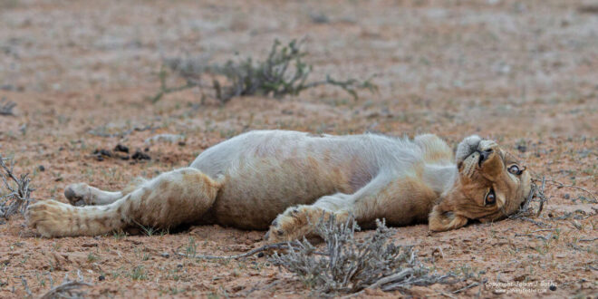 استلقى على ظهره مثل البشر.. مصور يوثق شبل أسد ظريف يشعر بالتخمة بعد وجبة دسمة
