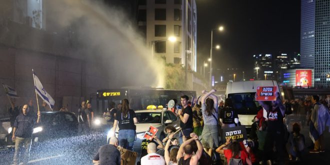 وأظهر مقطع فيديو استخدام الشرطة خراطيم المياه لتفريق المتظاهرين على طريق أيالون السريع في تل أبيب، واعتقال متظاهر واحد على الأقل تم نقله إلى سيارة للشرطة.