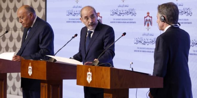 في مؤتمر صحفي مشترك، بين وزراء خارجية الأردن والولايات المتحدة ومصر، بعد الاجتماع الذي استضافته العاصمة الأردنية عمان، قال وزير الخارجية الأردني، أيمن الصفدي، السبت، إن الدول العربية طالبت بوقف إطلاق النار الفوري، وإنهاء هذه الحرب.