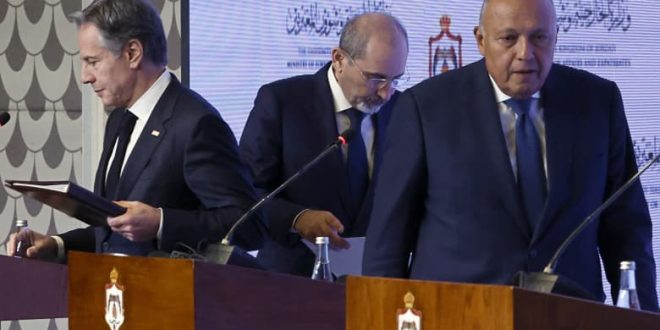 ووقف وزيرا خارجية الأردن ومصر إلى جانب بلينكن في مؤتمر صحفي بعد القمة، ودعا مرة أخرى إلى وقف فوري لإطلاق النار وأدانا بشدة الهجوم الإسرائيلي على غ ز ة، في حين دعا بلينكن إسرائيل مرة أخرى إلى “اتخاذ كل الإجراءات الممكنة” لمنع سقوط ضحايا من المدنيين، وهي الرسالة التي نقلها في اجتماعات في تل أبيب، الجمعة.