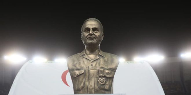 وانتشرت صور تُظهر وجود تماثيل لقائد فيلق القدس السابق في الحرس الثوري الإيراني، قاسم سليماني، عند ممر دخول اللاعبين إلى أرضية ملعب “نقش جهان”.