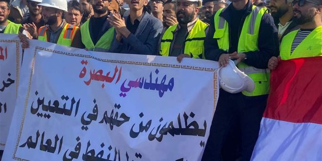 تجددت، اليوم الأربعاء 10 كانون الثاني/يناير 2024، تظاهرات الخريجين من شريحة المهندسين امام موقع شركة نفط البصرة في منطقة الحكيمية.