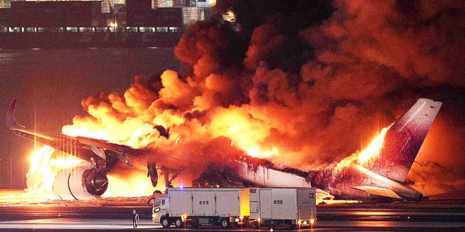 اشتعلت النيران في طائرة إيرباص A350-900 بعد أن حلقت في هانيدا قادمة من مدينة سابورو بشمال اليابان الساعة 5:46 مساء. بالتوقيت المحلي (3:46 صباحًا بالتوقيت الشرقي). وأظهر مقطع فيديو تردد على موقع التواصل الاجتماعي كرة نارية ضخمة تندلع مع اشتعال الطائرة، تاركة وراءها أثرا ناريا على المدرج.