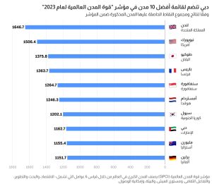 مؤشر قوة المدن العالمية لعام 2023 الصادر عن مؤسسة “موري موموريال”، وهي هيئة بحثية أنشأتها شركة “موري بيلدينغ”، المتخصصة في التطوير الحضري في اليابان، لتقييم وتصنيف المدن الكبرى في العالم حسب “جاذبيتهم” أو وقوتهم التنافسية في جذب الناس، ورأس المال والشركات من جميع أنحاء العالم.
