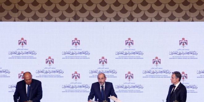 وأضاف وزير الخارجية المصري، في مؤتمر صحفي من العاصمة الأردنية عمان، مع نظيريه الأردني والأمريكي، أن “الاجتماع أتاح للدول العربية المشاركة فيه الإعراب عن رؤية موحدة وموقف موحد إزاء الأزمة”.
