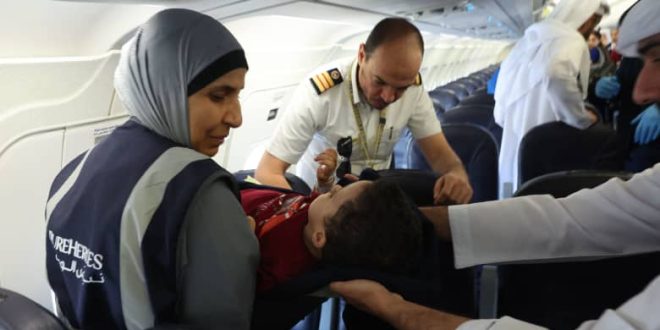 وذكرت الخارجية الإماراتية في بيان السبت: “حطت الطائرة القادمة من مطار العريش في جمهورية مصر العربية، في مطار أبوظبي، والتي تحمل على متنها الأطفال والذين هم في أمس الحاجة للمساعدة الطبية ممن يعانون من إصابات وحروق شديدة، ومرضى سرطان يحتاجون إلى علاج حثيث”.