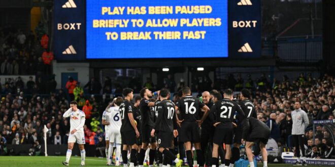— توقفت مباراة بين نادي مانشستر سيتي ونظيره ليدز يونايتد، في ملعب "إيلاند رود"، السبت، ضمن مباريات الجولة الـ28 من الدوري الإنجليزي الممتاز (البريميرليغ)، وذلك حتى يكسر اللاعبون المسلمون صيامهم.