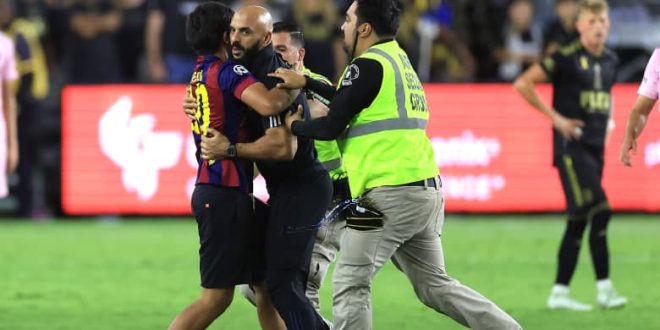 أظهرت لقطات مصورة اقتحام أحد المشجعين أرض الملعب، للقاء اللاعب ليونيل ميسي، في أعقاب مواجهة نادي إنتر ميامي و نظيره لوس أنجلوس، ضمن منافسات الدوري الأمريكي لكرة القدم، فجر الاثنين.