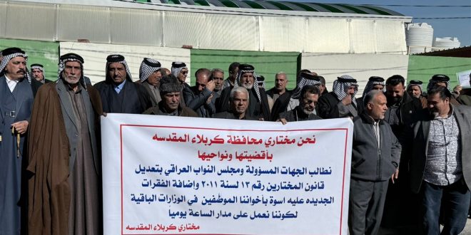وقال مراسل الوكالة أن “العشرات من مختاري المحافظة عبروا عن احتجاجهم أمام مكتب مجلس النواب في المحافظة للمطالبة بتعديل قانون المختارين رقم (13) لسنة 2011، فضلًا عن المطالبة بتخصيص رواتب لهم وقطع أراض”.
